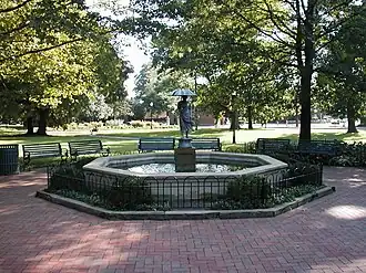 The current fountain replaced one depicting Hebe, the goddess of youth, installed as a drinking fountain in 1872. This fountain was relocated to a pond during the 1920s, and an umbrella was added. The statue disappeared during the 1950s.[3] Local residents wanted to restore the original fountain and sculpture, resulting in the installation of the current structure in 1996.[2][4] The statue is mysteriously draped in a red cloak each holiday season.[5]