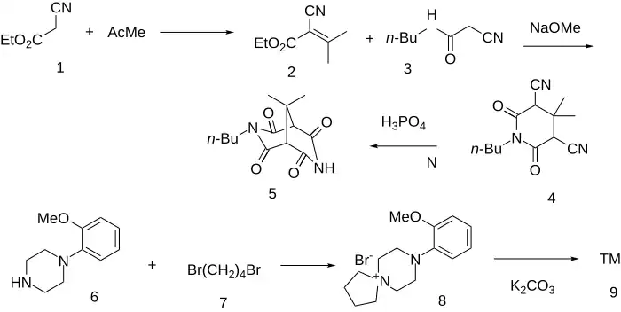 The condensation between ethyl cyanoacetate (1) and acetone gives ethylisopropylidenecyanoacetate [759-58-0] (2). This product is reacted with N-butylcyanoacetamide [39581-21-0] (3) in sodium methoxide solution to give N-butyl-2,4-dicyano-3,3-dimethylglutarimide, CID:10681941 (4). The glutarimide is cyclized with phosphoric acid to yield 3-butyl-9,9-dimethyl-3,7-diazabicyclo[3.3.1]nonane-2,4,6,8-tetraone, https://pubchem.ncbi.nlm.nih.gov/compound/10825633 CID:10825633 (5).