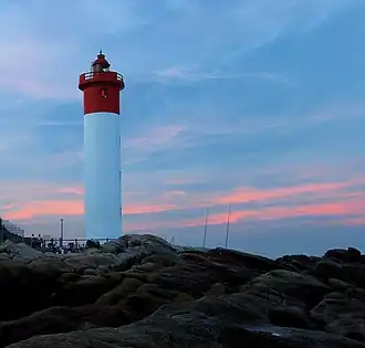 The uMhlanga Rocks Lighthouse was completed in 1954 and stands on the beach in uMhlanga, KwaZulu-Natal. It is unmanned and active. The round concrete tower is white below and red above. The lighthouse is 21 m high and has a focal plane of 25 m above the high water mark.