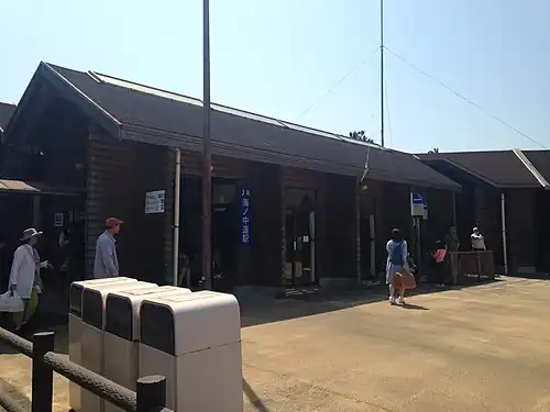 A distant view of the station and Umi-no-Nakamichi Seaside Park entrance. The station building is to the left of the picture.