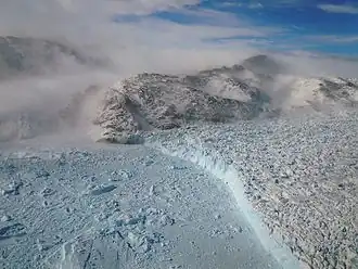 Unlike the jagged and forbidding appearance of most fjord systems in East Greenland, the Umivik area has a relatively gentle shape. Here the massive Greenland ice sheet comes down to the shore in smooth, even undulations and the landscape looks unbroken, with only few glimpses of bare rock.[1] Owing to this smoothness, Umivik Bay was chosen as launching point for westward overland crossings, including the pioneering 1888 Greenland venture by Fridtjof Nansen.