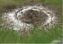 The north-northeastern part of the island contains tholeiitic basaltic rocks and is characterized by tension faulting, lava flows, and fragmental deposits of igneous rocks.[18][19] The volcano of Mount Okmok, characterized by its 5.8 miles (9.3 km) wide circular caldera, it located in the northwestern part of the island. This generally flat central basin has an average elevation of 370 m above sea level, with the rim of the caldera reaching a height of 1,073 metres (3,520 ft).[2] Following the formation of the caldera, numerous satellite cones and lava domes have formed on the flanks of the volcano. They include Mount Tulik (1,253 metres (4,111 ft)) on the caldera's southeastern slope, Mount Idak (585 metres (1,919 ft)) to the northeast, and Jag Peak.[2][20] A crater lake once filled much of the caldera to a depth of over 500 feet (150 m), but the lake ultimately drained through a notch eroded in the northeast rim. The prehistoric lake attained a maximum depth of about 150 metres (490 ft) and the upper surface reached an elevation of about 475 metres (1,558 ft), at which point it overtopped the low point of the caldera rim. Small, shallow remnants of the lake remained north of Cone D at an altitude of about 1,075 feet (328 m): a small shallow lake located between the caldera rim and Cone D; a smaller lake (named Cone B Lake) farther north near the caldera's gate. After the 2008 eruption, the hydrogeology of the caldera was greatly changed with five separate sizable lakes now emplaced. In addition to the caldera lakes, Cone A, Cone E, and Cone G and the new 2008 vent on Cone D contain small crater lakes. The volcano is currently rated by the Alaska Volcano Observatory as Aviation Alert Level Green and Volcanic-alert Level Normal.