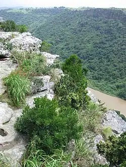 The plateau areas consist of grasslands (Pondoland Sourveld), which drop off into Coastal Scarp Forest in the gorge along the river below.[1] Some of the cliff-faces are up to 240 m high, and a colony of Cape vultures is said to nest on them.[1] The cliffs were formed by the river incising into Natal Group Sandstone, and many endemic plants grow on this substrate and the soils derived from it.[3] The grassland areas of the reserve are known for their natural display of wildflowers in late spring, depending on rainfall and burns.[1]