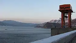 The Unbong Dam, or Yunfeng Dam, is a concrete gravity dam on the Yalu River which borders China and North Korea. It is located 33 km (21 mi) northeast of Ji'an in Jilin Province, China and Chasŏng in Chagang Province, North Korea. The primary purpose of the dam is hydroelectric power generation and it supports a 400 MW power station. Construction of the dam had initially began in August 1942 but was halted in 1945 after the surrender of Japan ending World War II.[1] In October 1959, construction on the dam recommenced and in September 1965, the first of the four 100 MW Francis turbine-generators was operational. The last generator was operational on 4 April 1967. The 113.75 m (373 ft) tall dam creates a reservoir with a storage capacity of 3,895,000,000 m3 (3,157,728 acre⋅ft). The dam's spillway is an overflow type with 21 floodgates and has a maximum discharge of 21,900 m3/s (773,391 cu ft/s). The dam is located before a bend in the river and its power station is located on the other side of a ridge that meets the dam's right abutment. Water is delivered to the power station via two tunnels, 775 m (2,543 ft) and 759 m (2,490 ft) long. Generators 1 and 3 deliver power to China while 2 and 4 deliver to North Korea.[2][3]