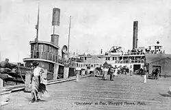 ![]() Sidewheeler ferry Uncatena at Union Wharf in Vineyard Haven, MA before 1908.