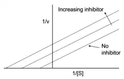 It can be recognized by two observations: first, it cannot be reversed by increasing the substrate concentration , and second, linear plots show effects on and , seen, for example, in the Lineweaver–Burk plot as parallel rather than intersecting lines. It is sometimes explained by supposing that the inhibitor can bind to the enzyme-substrate complex but not to the free enzyme. This type of mechanism is rather rare,[2] and in practice uncompetitive inhibition is mainly encountered as a limiting case of inhibition in two-substrate reactions in which one substrate concentration is varied and the other is held constant at a saturating level.[3][4]