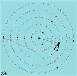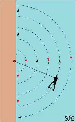 The general procedure is to start from a fixed central point, and to search the circumference of a circle where the radius is defined by a search line anchored at the central point. The radius of the circle is dependent on visibility, and is increased after each circle has been completed, by an amount which allows the diver to either see or feel an overlap between the current arc and the previous arc.[5][6]