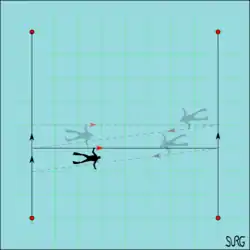 This is the visual equivalent of the snag-line search. A team of divers spreads out along a length of rope at spacing suited to the visibility, terrain and size of the target. The team leader may theoretically be anywhere on the rope, but is usually at one end or in the middle. He swims on a constant heading which is known to all the divers, who swim on the same heading. Each diver must ensure that he does not get ahead of or lag behind the diver to his side who is closer to the leader, and that the rope is kept taut. In this way an evenly spaced line of divers swims a straight sweep with a width equal to the length of the swim line. It can work but requires concentration and a bit of practice, as all the divers are also supposed to be diligently searching for the target. The swim line method can also be applied to a circular pattern, but this is inefficient and usually badly co-ordinated as the direction is constantly changing. A variation on this pattern that can work is in a river or canal where the ends are controlled by line tenders on the banks, who can communicate and can sweep the line round curves. Complications arise with variations in width but most of these can be dealt with by planning ahead. Line signals can instruct the divers to adjust their spacing to suit conditions.[6][3]