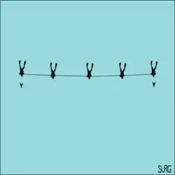 A major variation on the circular search is the pendulum search, also known as the arc or fishtail search.[5][6] in which the diver stops and changes direction at the end of each arc. This is used when there is insufficient space to complete a circle, as when controlled from the shore, when the search area is limited to a sector to one side of the control point, or there is a major obstruction limiting the extent of the searchable sector. Divers on surface supply may change direction at the end of each arc even when using a full 360° pattern to avoid twisting the umbilical. The pendulum search can also be done with more than one diver on the search line, but this requires considerable skill and co-ordination, particularly in low visibility.[3]