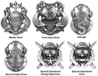 The various diver insignia (also known as "diver badges", "dive badges," and colloquially known as "dive bubbles")[1] of the uniformed services of the United States are badges awarded to service personnel once they have graduated an appropriate diving course. The badges' origins lie in the cloth patch decoration worn by United States Navy divers on the upper-portion of the enlisted service uniform's left sleeve during the first part of World War II, when the rating insignia was worn on the right sleeve. When enlisted rating insignia were shifted to the left sleeve in late World War II, the patch shifted to the upper right sleeve. The Navy transitioned to a metal breast insignia (with cloth breast insignia for utility and battle uniforms) in the late 1960s, with the other services following suit over the following decades.
