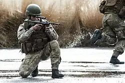 NZDPM and NZDDPM camouflage patterns were replaced in 2013 by a single camouflage pattern and a new uniform called the New Zealand Multi Terrain Camouflage Uniform (MCU) for all branches of NZDF.[52] The camouflage pattern is a variant of the Ghostex family of camouflage patterns by Canadian company Hyperstealth Biotechnology Corp. The cut of the MCU is in the ACU style, with mandarin collar, Velcro closures, slanted arm pockets, and removable elbow pads. However, the MCU pants are not in the ACU style but are instead in the style of the Crye G3 combat pant with additional forward-facing thigh pockets, removable knee pads, and Velcro-adjustable cuff flaps for ease of blousing, the style of which is otherwise usually associated with contemporary Special Forces and Police tactical unit assault uniforms.[53][54][55] The MCU, with the addition of a beret or sometimes the MRH, became the working uniform.[56]