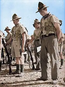 During the Gallipoli campaign New Zealand troops wore a variety of hot-weather khaki drill uniforms with either slouch hats or the forage cap of the standard 1912 uniform.[9] Supply difficulties and the harsh nature of terrain and climate during this campaign meant that little emphasis was placed on smartness or uniformity of dress.[10]