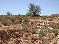 A gully erosion in Australia caused by rabbits, an unintended consequence of their introduction as game animals