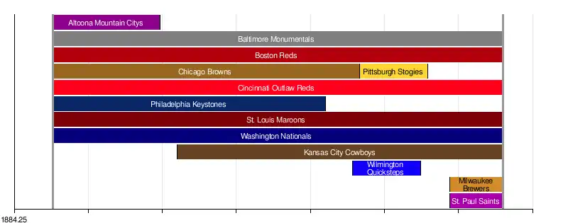 - April 17: Season opens with the following franchises: Altoona Mountain Citys, Baltimore Monumentals, Boston Reds, Chicago Browns, Cincinnati Outlaw Reds, Philadelphia Keystones, St. Louis Maroons, and Washington Nationals
