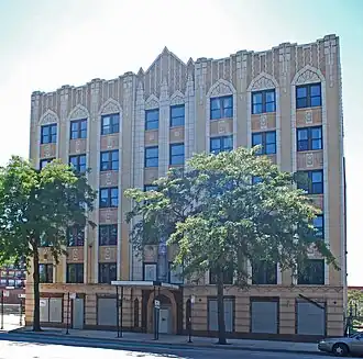 The Union Park Hotel (formerly the Viceroy Hotel[2]) is a historic hotel building located at 1519-1521 W. Warren Boulevard in Chicago, Illinois. The building was built in 1929-30 as an apartment hotel, a common type of housing for Chicago laborers in the 1920s. The hotel's Art Deco design reflects the national popularity of the style in the 1920s. The building's piers give it a vertical emphasis common to Art Deco works, and its decorative elements reflect the style's geometric focus. The colorful brick and terra cotta facade of the building is also characteristic of Art Deco buildings of the late 1920s, though color is seldom used extensively in Chicago's other Art Deco buildings.[3]