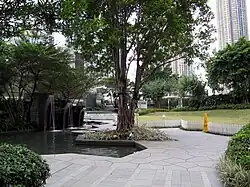 On the roof of the Union Square shopping mall, three storeys above the ground, is a pseudo ground level public place with walkways, gardens and a central plaza surrounded by outdoor cafés and bars. Entrances to the various building complexes of Union Square are located on this level.[1] Although Union Square was conceived as an interconnected space centred on transport infrastructure, it was criticised in a 2013 University of Hong Kong study as being cut off from its surroundings, especially for pedestrians. Paul Zimmerman said Union Square is "an island of the rich disconnected from its surroundings", and a lesson for future urban planners. This concern is shared by Farrell, who said there were pre-determined site constraints, and little could be done to mitigate them.[1]