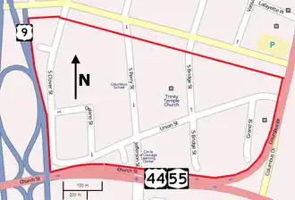 The district is roughly rectangular. It is bounded on the north by the rear property lines of lots on the south side of Main Street, on the east by the crest of the slope up from the Hudson River (roughly the rear property lines of the west side of Market Street, 200 feet (61 m) above the water), on the south by US 44 and NY 55 (the East-West Arterial) and on the east by US 9 (the North-South Arterial). This eight-block area of 42 acres (17 ha) included, at the time of its Register listing, 173 contributing properties. None of them are separately listed.[1]