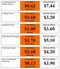 Unit pricing was implemented into British, European Union and North American markets during the early 1970s.[5][6][7][8][9] In December 2009, the Australian federal government implemented Trade Price legislation to force all large supermarkets and groceries stores to display unit pricing information on shelf labels (s.51AE, Trade Practices Act 1974).[10]