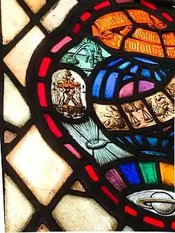 The interior underwent extensive renovation in the 1920s, including installation of stained-glass windows by the firms of Franz Xaver Zettler (sanctuary and vestibule) and Charles Connick (women's parlor). The interior has stayed essentially unchanged since those renovations, and, like the exterior, the interior work is atypical of the firms that produced it.[6] Subjects memorialized in the windows include colonizer Christopher Columbus and enslaver Thomas Jefferson.[7] The choices were influenced by the views of a founding member of the church, Milton T. Garvin (1860–1936), a prominent local merchant and philanthropist who personally funded the construction and decoration of the building and worked closely with the architects and ministers involved. Garvin's family were Hicksite Quakers from the Nottingham Lots community of southern Pennsylvania and Maryland,[8] and he joined the "new Unitarian movement", as he referred to it,[9] in the absence of a recognized Quaker meeting in Lancaster.[10] Garvin became a Unitarian activist and initiated the Association's Religious Arts Society (1923), but was a life-long "advocate for universal peace",[11] which complicated his attitude toward the controversial pro-war stance of the Association during World War One.[12] After the war Garvin commissioned sanctuary windows which, while taking World War One and the American Civil War as subject matter, advocate for peace and reconciliation as core values in American history and civic life. The sanctuary windows and other sanctuary decoration were designed by the Swiss-American architect and artist Woldemar H. Ritter (1880 – c. 1935), whose modernist artistic approach was approved by Garvin and distinguishes the Lancaster windows from other work by Zettler. The sanctuary windows were installed in 1926. The windows by Charles Connick were commissioned for the women's parlor and were designed by Connick; they were installed in 1929 and dedicated in 1930.