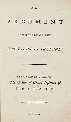 Thomas Russell had invited Tone to the Belfast gathering in October 1791 as the author of An Argument on behalf of the Catholics of Ireland.[30] In honour of the reformers in Belfast, who arranged for the publication of 10,000 copies, this had been signed A Northern Whig. Being purportedly of French Huguenot descent, Tone may have had an instinctive empathy for the religiously persecuted, but he was "suspicious of the Catholics priests" and hostile to what he saw as "Papal tyranny".[31] (In 1798 Tone applauded Napoleon's deposition and imprisonment of Pope Pius VI).[32]