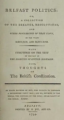 - ^ William Drennan, Belfast Monthly Magazine, 7 (1811) quoted in Jonathan Jeffrey Wright (2013), The 'Natural Leaders' and their World: Politics, Culture and Society in Belfast c. 1801–1832, University of Liverpool Press (ISBN 978-1846318481), p. 75