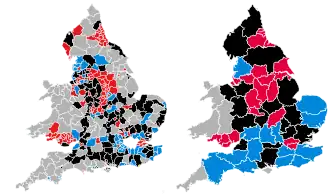 ![]() Map of the results of the elections in England and Wales, showing party control by district (left) and county (right). | |||||||||||||||||||||