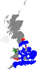 In total, 4,851 council seats were up for election in 88 councils; additionally six new mayors were directly elected.[16] Approximately 10,000 people were candidates for election.[17] All 32 councils in Scotland (1,227 seats) and all 22 councils in Wales (1,254 seats) were up for election; an additional 34 councils (2,370 seats) in England were up for election.[16] Of the 35 English councils up for election, 27 were county councils, seven were unitary authorities, and one was the Doncaster Metropolitan Borough Council.[18]