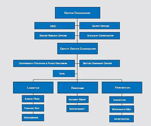 Coast Guard Sectors serve as one-stop-shops for marine safety, security, and environmental protection for major seaports and regions. They bring multi-mission capabilities to life on the front lines of the maritime environment, where Sector Commanders are afforded broad authority.[3]