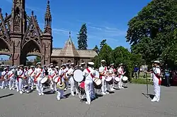 The band for decades represented the academy at presidential inaugural parades.[8] The band plays an essential in the "Ceremony of Beating Retreat", which is a military tattoo based in British roots. It takes place during the USMMA parent weekend, and usually has parents of midshipmen in attendance.[9] The band traditionally performs at the end of the National Memorial Day Parade in May. The band has also historically taken part in civil parades/events, including the Macy's Thanksgiving Day Parade, the Cotton Bowl Classic Halftime Show, the Miss America Pageant, and events on Cow Harbor Day.