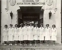 The first group of 24 Naval flight nurses graduated from the Navy Flight Nurse School at the Naval Air Station Alameda, California on 22 January 1945.[16] In addition to flight nurse procedures, they were trained to swim one mile, tow or push a victim for 220 yards, and swim 440 yards in 10 minutes.[17] The newly minted flight nurses soon began active flying service on 24 flying teams, consisting of a nurse and a pharmacist's mate. Each 12-plane squadron operated with the following medical personnel: 24 flight nurses, 24 pharmacists' mates, one flight surgeon, and one Hospital Corps officer. After a certain number of transcontinental trips with wounded servicemen, the teams were sent to the Pacific to serve in the Naval Air Evacuation Service, the first arriving in Guam in early February 1945.[18] There were three main flights of air evacuation planes to which flight nurses were assigned. First, from target areas to forward hospitals, such as Guam: second, from those forward hospitals to Pearl Harbor; and third, from Pearl Harbor to the contiguous United States. Nurses were rotated so that flight hours did not exceed 100 per month and they were also rotated between combat and noncombat flights.[18]
