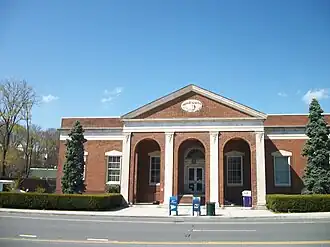 The current post office was designed by consulting architects Delano and Aldrich for the Office of the Supervising Architect of the Department of Treasury, whose responsibilities then included construction of federal buildings. It is a small one-story, brick building with marble trim in the Colonial Revival style. The front facade features three tall brick arches flanked by Doric order marble pilasters.[2]