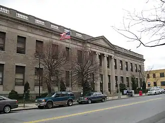 The Long Island City Post Office is a historic post office building located at Long Island City in Queens County, New York, United States. It was built in 1928, and is one of a number of post offices in New York designed by the Office of the Supervising Architect under director James A. Wetmore. The building is a two-story, symmetrically massed brick building with limestone trim in the Colonial Revival style. It features a frontispiece with four semi-engaged limestone Ionic order columns that support a pedimented entablature.[3]