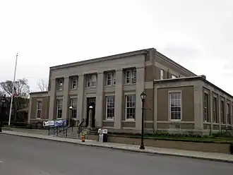 US Post Office-Wellsville is a historic post office building located at Wellsville in Allegany County, New York. It was designed and built in 1931–1933. It is one of a number of post offices in New York State designed by consulting architects Murphy & Olmsted to the Office of the Supervising Architect of the Treasury Department. It is a two-story, brick clad structure on a limestone clad foundation with two one-story wings. The structure is in the Classical Revival style. The interior includes two bas relief panels; one depicting the first League of Peace of the Iroquois tribes and the second depicting Mary Jemison, "White Woman of the Genesee." It is located across from Wellsville Erie Depot.[2]
