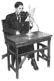 An initial demonstration transmission was given at the company headquarters, located at 110 West Thirty-fourth Street in New York City, in early September 1910.[4] The equipment used was similar to that which was employed in Budapest. As in Hungary, announcers were called "stentors", and because vacuum tube technology had not been developed yet, there were limited methods for amplification, so to compensate the stentors had to speak as loudly as possible into oversized dual-microphones. The lack of amplification also meant that subscribers needed to listen through headphones instead of loudspeakers. On February 14, 1911 U.S. patent 984,235, describing "a telephone system... adapted for supplying innumerable subscribers... general news, musical compositions, and operas, sermons, correct or standard time and other happenings at stated intervals of day and night" was granted to Árpád Németh, and assigned to the company.