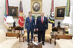 In January 2019, Leopoldo López's Popular Will party attained the leadership of the National Assembly of Venezuela according to a rotation agreement made by opposition parties, naming Juan Guaidó as president of the legislative body.[73] Days after Guaidó was sworn in, he and López reached out to the United States Department of State and presented the idea that Guaidó would be named interim president and that the United States could lead other nations to support Guaidó in an effort to remove Maduro; former Director of the Central Intelligence Agency and Secretary of State Mike Pompeo approved of the idea.[74] Though the National Assembly sought to assume executive power from Maduro itself, López and Guaidó continued to work with the State Department without the knowledge of other opposition groups since they believed their objectives would be blocked.[74] State Department official Keith Mines wrote on 20 January that Guaidó declaring himself president "could have the impact of causing the regime to crumble in the face of widespread and overwhelming public support" and on 22 January, Vice President Mike Pence called Guaidó personally and told him that the United States would support his declaration.[74] Neuman wrote that "it's likely that more people in Washington than in Venezuela knew what was going to happen."[74] Guaidó declared himself the acting president of the country, disputing Maduro's presidency and sparking a presidential crisis. Minutes after the declaration, the United States announced that it recognized Guaidó as president of Venezuela while presidents Iván Duque of Colombia and Jair Bolsonaro of Brazil, beside Canadian Foreign Affairs Minister Chrystia Freeland, made an abrupt announcement at the World Economic Forum that they too recognized Guaidó.[74][75]
