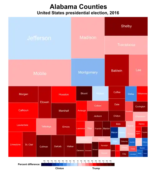 Alabama has voted for the Republican candidate in every election since it was won by Ronald Reagan in 1980. As such, Trump was heavily favored to win the state. On the day of the election, Trump won the election in Alabama with 62.08% of the vote, while Clinton received 34.36% of the vote.[3] The state had given 60.55% of its votes to Republican nominee Mitt Romney in 2012, meaning that it had shifted 1.53% more Republican from the previous election. Trump's margin of victory in Alabama was 27.72%, a 5.53% increase from Romney's 22.19% margin of victory. Alabama did not swing particularly hard to the right, as its white voters without college degrees were already extremely Republican.[4]