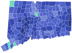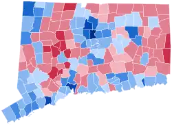 Trump's strongest county in the state was rural Litchfield County, while Clinton's biggest win was in adjacent, more urban Hartford County.[3] Areas that swung in Clinton's favor were mainly concentrated in suburban Fairfield County, in towns like Greenwich, Darien, New Canaan, and Westport.[4][3] This area is home to many New York City commuters. Other Democratic swings happened in suburbs outside Hartford, such as Avon, Granby, East Granby, and Glastonbury, as well as outside New Haven, in towns like Guilford, Madison, and Woodbridge.[4][3] This was the first time since 1888 that Darien and the first time since 1912 that Easton voted Democratic, largely due to opposition to the populist Trump among historically Republican affluent and educated voters. By contrast, areas that swung hard for Trump were mainly located in Windham County and northern New London County, in towns like Killingly, Sterling, Plainfield, and Voluntown.[5] This mirrored a national trend of Trump gaining White working-class support.