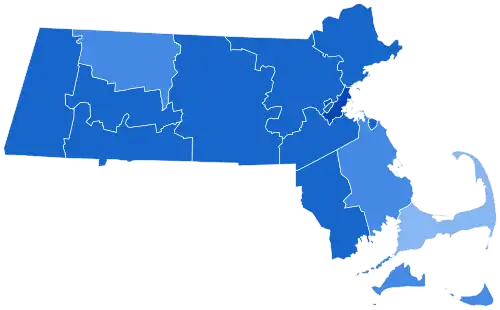 Johnson swept every county in Massachusetts, the first time a Democratic presidential candidate had done so. This feat would not be repeated until 1992 (since which time, Democrats have swept every county in Massachusetts in every modern election).[7] Johnson was the first Democrat ever to win Barnstable County, Dukes County, Franklin County or Plymouth County, and the first to carry Nantucket County since Woodrow Wilson in 1916.[8] In Suffolk County, home to the state's capital and largest city, Boston, Johnson took 86.2% of the vote. Not until 2020 would any Massachusetts county again hand a presidential candidate more than 80% of the popular vote (on that occasion, Suffolk County to Joe Biden).