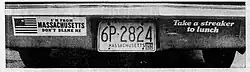 After Nixon was re-elected, he would later resign only a year and a half into his second term due to his involvement in the Watergate scandal and the illegal activities he committed. After the Watergate scandal broke and Nixon resigned due to criminal activity, bumper stickers with the words "Don't blame me! I'm from Massachusetts" (and variants) became a symbol of the sentiment felt by Massachusetts residents, serving as a proverbial "I told you so" to the 49 states that supported Nixon's re-election.[8]