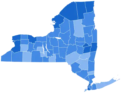 Many counties ended long streaks of not voting Democratic: It was the first time since 1948 that Monroe County voted for a Democrat, the first time since 1936 that Richmond, Rockland, Schenectady, and Sullivan counties voted for a Democrat, the first time since 1932 that Rensselaer County voted for a Democrat, the first time since 1916 that Chemung, Greene, Hamilton, Otsego, and Schoharie counties voted for a Democrat, the first time since 1912 that Cattaraugus, Columbia, Herkimer, Lewis, Nassau, Putnam, Seneca, Steuben, Suffolk, Tompkins, Ulster, and Westchester counties voted for a Democrat, the first time since 1876 that Orange County voted for a Democrat, the first since 1872 that Dutchess county voted for a Democrat, and the first time since 1852 that numerous upstate counties voted for a Democrat, namely: Allegany, Broome, Chenango, Delaware, Jefferson, Madison, Onondaga, Oswego, St. Lawrence, Tioga, Warren, and Wayne counties. Finally, Fulton and Cayuga counties had not voted Democratic since 1844, and Saratoga county not since 1836 – 128 years prior.[12]