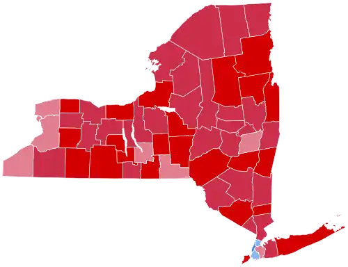 Nearly all counties in New York State turned out for Nixon, and only the New York City boroughs of Manhattan, Brooklyn and the Bronx voted for McGovern. McGovern was able to win New York City overall with his victories in these three boroughs, taking two-thirds of the vote in Manhattan and also winning majority votes in Brooklyn and the Bronx. However, Nixon was able to put in a relatively strong performance citywide, winning 56% of the vote in Queens and 74% of the vote in Staten Island. 1972 remains the last election in which a Republican presidential nominee has won any New York City borough other than Staten Island, Queens being a heavily populated county that was historically key to Republican competition in New York. This was also the last election in which a Republican presidential nominee has won the upstate counties of Erie County, where the city of Buffalo is located, and Albany County, where the state capital of Albany is located, as well as in turn, the last Republican to win every county of upstate New York.[1] Both of these counties have become solidly Democratic in the years that have followed.