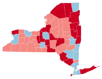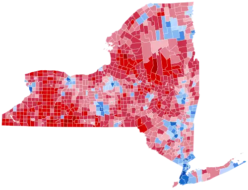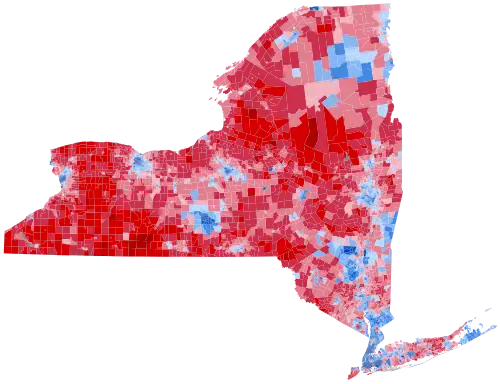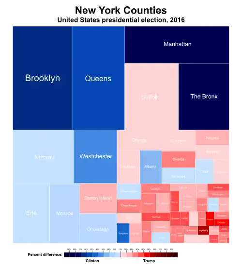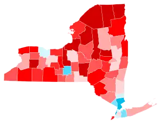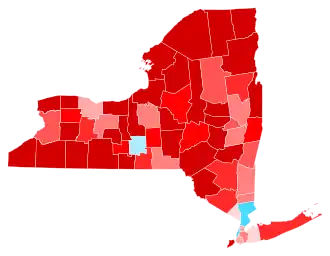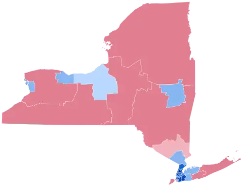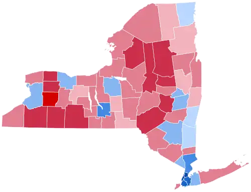 While heavily Democratic New York City had secured consistent Democratic landslides in New York State for 3 decades, since 1992 every Democratic presidential candidate would have still carried New York State even without the massive Democratic vote margins provided by the 5 boroughs, albeit by substantially closer margins. In 2012, Obama won New York State outside of New York City with 54.03% of the vote compared with Mitt Romney's 44.54%. With Donald Trump having made major gains over Romney's performance across Upstate New York and improving overall in suburban downstate, Hillary Clinton was heavily dependent on New York City for her victory; her margin of 1,724,416 votes in the Five Boroughs accounted for almost all of her statewide majority. Clinton did manage to continue the Democratic winning streak in New York State outside of New York City, albeit just barely. Removing the 5 boroughs of New York City from the result, Clinton received 2,391,549 votes while Trump received 2,324,985 votes, meaning Clinton would have won New York State without the city by 66,564 votes, a margin of 1.4% out of all statewide votes cast outside of the city. However, when removing the ten counties in the state that are part of the New York metropolitan area (The Boroughs, Long Island, and Putnam, Rockland, and Westchester Counties), Trump became the first Republican to carry Upstate since George H. W. Bush did so in 1988, obtaining 1,463,217 votes in the state's other 52 counties compared to Clinton's 1,393,810 votes, a margin of 69,407 votes, though George W. Bush came within 8,056 votes of John Kerry in Upstate during the 2004 election. The 2016 United States Senate election in New York held on the same day turned notably different. While Clinton only carried 12 upstate counties, Chuck Schumer won all counties in New York state except 5 and captured over 70% of the vote. As of the 2024 United States presidential election, this is the most recent presidential election where the following counties voted Republican: Broome, Essex, Rensselaer, and Saratoga.