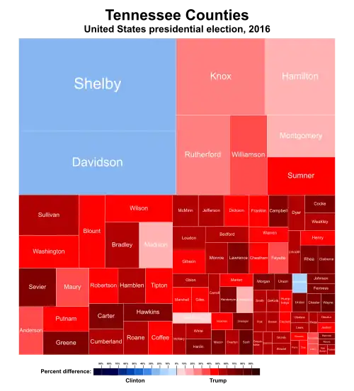 Despite losing the state, Clinton made large gains in Williamson County, Tennessee (home to Franklin, Tennessee), the most highly-educated and wealthiest county in the state. The county is also one of the most highly-educated counties in the country, with over 60% of adult residents having a Bachelor's degree (see the map). The county remained very red, giving Trump 64% of the vote, but shifted leftward by 11%.[16] Clinton also gained in Davidson County, Tennessee (home to Nashville, Tennessee) and Knox County, Tennessee (home to Knoxville, Tennessee).
