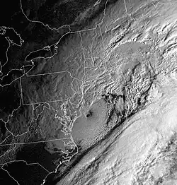 Coastal extratropical cyclones, known as nor'easters, bring a bulk of the wintry precipitation to the region during the cold season as they track parallel to the coastline, forming along the natural temperature gradient of the Gulf Stream before moving up the coastline.[63] The Appalachian Mountains largely shield New York City and Philadelphia from picking up any lake-effect snow, though ocean-effect snows are possible near Cape Cod.[64] The Finger Lakes of New York are long enough for lake-effect precipitation. Lake-effect snow from the Finger Lakes occurs in upstate New York until those lakes freeze over.[65] Bay-effect snows fall downwind of Delaware Bay, Chesapeake Bay, and Massachusetts Bay when the basic criteria are met. Ocean effect snows are possible downwind of the Gulf Stream across the Southeast.[66]