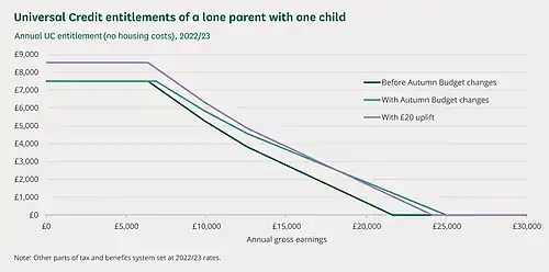 The October 2021 budget increased in-work support by increasing the work allowances by £500 a year, and reducing the post-tax deduction taper rate from 63% to 55%.[29] Iain Duncan Smith wrote that he was delighted that the taper rate would now be 55%, the level he wanted over a decade ago when he devised the scheme, but which had not been allowed by the Treasury.[30] Analysis by the Resolution Foundation showed that three-quarters of families on UC would be worse off compared to the previous temporary £20 per week uplift during the Covid crisis.[31]