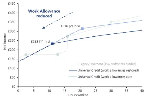 In 2015, the Chancellor, George Osborne, announced a future £3.2 billion a year cut to the overall Universal Credit budget after an attempt to cut Tax Credits that year was thwarted by parliament.[20] The Resolution Foundation has argued that this cut, which will be felt more keenly as millions more people transfer to Universal Credit,[21] risks the new system failing to achieve its original purpose of incentivising work in low-income households.[22] The amendments were:[20]