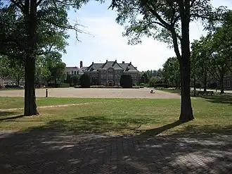 The classes are in three academic buildings. These stand around the central quad on both sides of the College Hall: