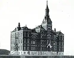The original Administration building, with a single tall spire reaching to 163 feet (50 m), was constructed through the decade of the 1890s and ultimately finished in 1899. It burned in 1906.[24][25] In the meantime, classes were held at various sites in Moscow. The new Administration building was designed by John E. Tourtellotte, who modeled the new structure after Hampton Court Palace in England.[20][13]