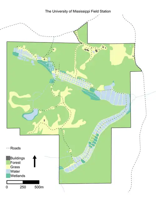 The UMFS encompasses 781 acres (316 ha) of the Eocene hills of the interior Gulf Coastal Plain along the headwater streams of the Little Tallahatchie River.[1] The ponds at the field station are located within a v-shaped valley originally formed by two streams: Bay Springs Branch and an unnamed stream that flows into Bay Springs Branch. Just outside the field station's boundary, Bay Springs Branch flows into Puskus Creek, which flows into Puskus Lake before continuing on to the Little Tallahatchie River.[2]: 2 Bay Springs Branch originally flowed along the north side of the valley, but after construction of the ponds it was rerouted to the south side, and now a smaller stream flows along part of the valley's north side. Likewise, the unnamed stream was also rerouted along with pond construction so that now there are two nearly identical streams along each side of the valley on the south side of the field station.[2]: 4 Bay Springs Branch splits on the west side of the field station, with one fork flowing from the ponds around Bay Springs Baptist Church and another flowing from a single pond on the west-central side of the field station.[4]