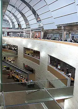 The Central Library is part of the Information Services Building and has over 2000 study spaces, 130 computer terminals, and laptop connections at 500 desks. It has Te Aka a Tāwhaki, a collection of Māori resources,[56] and the Special Collections consisting of about 9,000 books printed before 1801. In total, the Central Library has over 800,000 print and electronic materials relating to the arts and humanities, commerce, education, physical education, social sciences, and technology.[57] It was designed by the American architecture firm Hardy Holzman Pfeiffer and opened in 2001, replacing what was previously a 1960s-era modernist building.